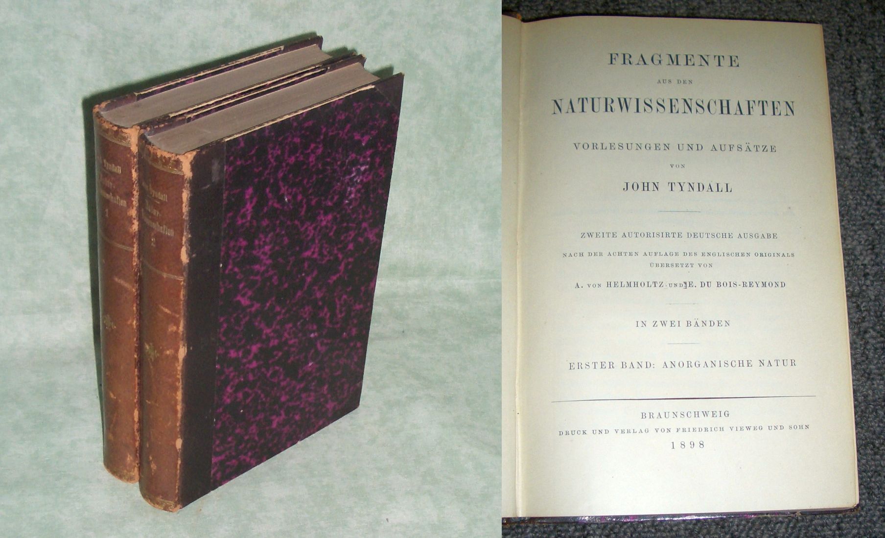 Naturwissenschaften – Chemie – Physik -Mathematik Tyndall, John. Fragmente aus den Naturwissenschaften. Vorlesungen und Aufsätze.Zweite autorisrte deutsche Ausgabe. Nach der achten Auflage des englischen Originals übersetzt von A. von Helmholtz und E. Bois-Reymond.. In zwei Bänden. Braunschweig. Vieweg. 1898.. 514. 522 Seiten Halbleder mit goldgepr. Rückentitel. Einband etwas berieben, Stempel und Name am Vorsatz, insgesamt ein gutes Ex.
