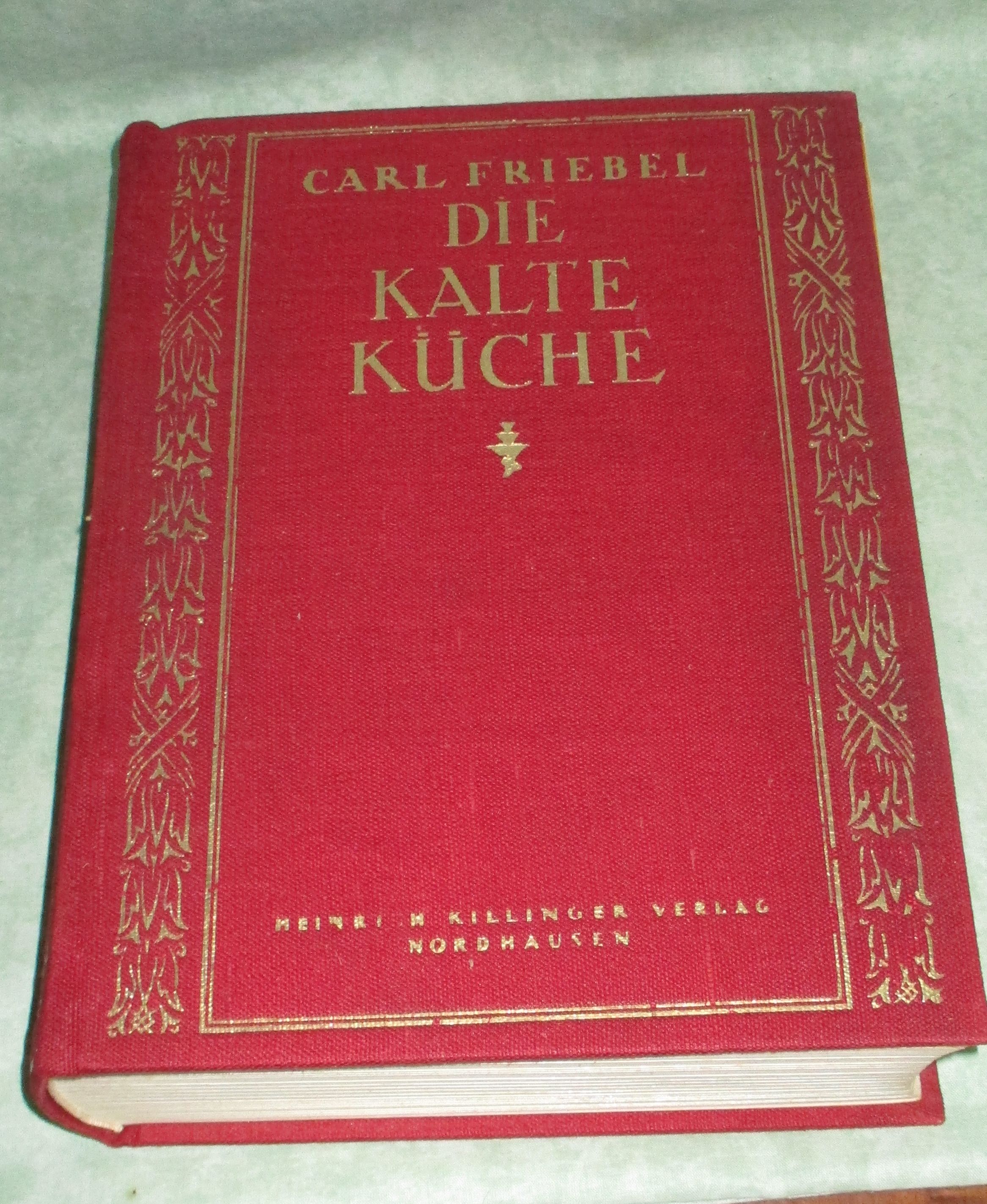 Koch- + Haushaltungsbücher Friebel, Carl. Die kalte Küche. Handbuch der modernen Anrichtekunst. Nordhausen, Killinger. Um 1930. 28 x 21,5 cm. 534 Seiten, 213 Textabb., 20 mehrfarbige Tafeln. (Ohne die Mappe mit den Trüffelzeichnungen) Goldegpr. Originalleinen. Beim Index einige Seiten verbunden. (Zwei Seiten doppelt, dafür fehlen die letzten 2 Seiten.