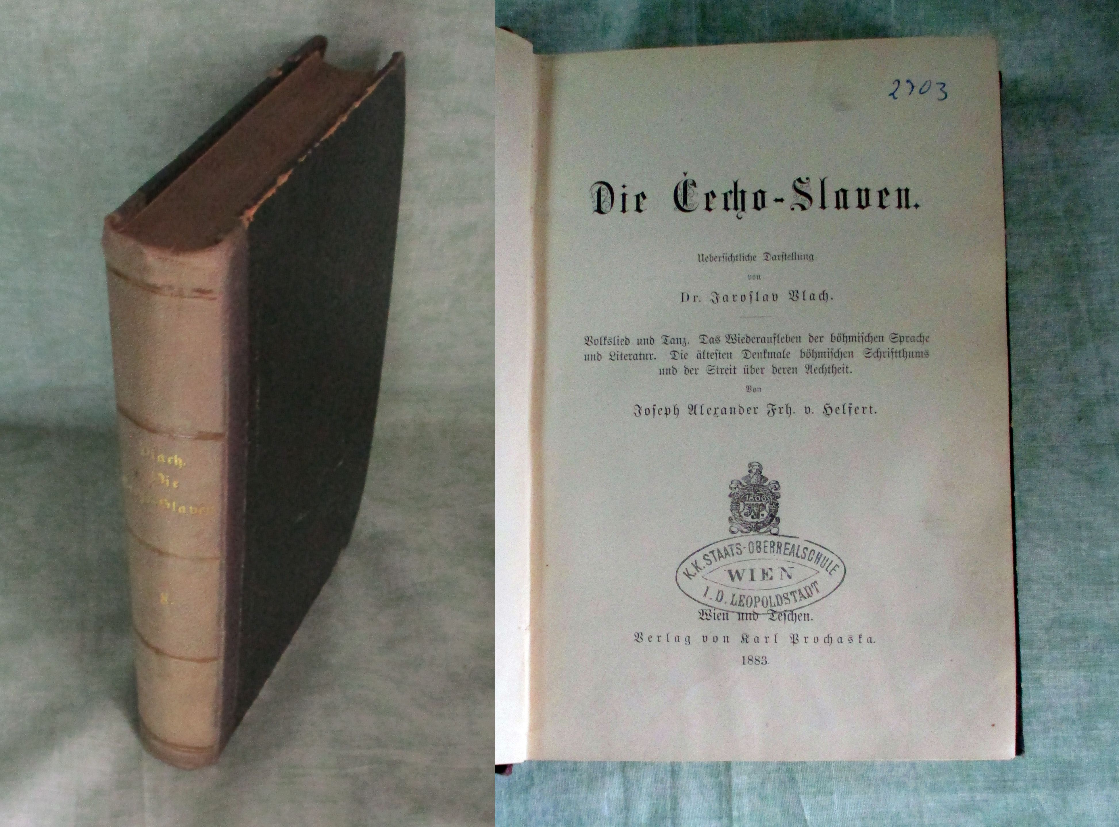 Böhmen / Mähren / Sudeten Vlach, Jaroslav: Die Cecho-Slaven. Übersichtliche Darstellung. Volkslied und Tanz. Das Wiederaufleben der böhmischen Sprache und Literatur. Die ältesten Denkmale böhmischen Schriftthums und der Streit über deren Aechtheit. Wien. Prochaska. 1883. (4 Bl.) 450 Seiten. Schlichter Bibliothekseinband mit goldgepr. Rücken. Einband leicht berieben und bestossen, Bindung fest, innen sauber und anstreichungsfrei. Stempel einer Wiener Schule auf der Titelseite. Die Völker Oesterreich-Ungarns, 8.