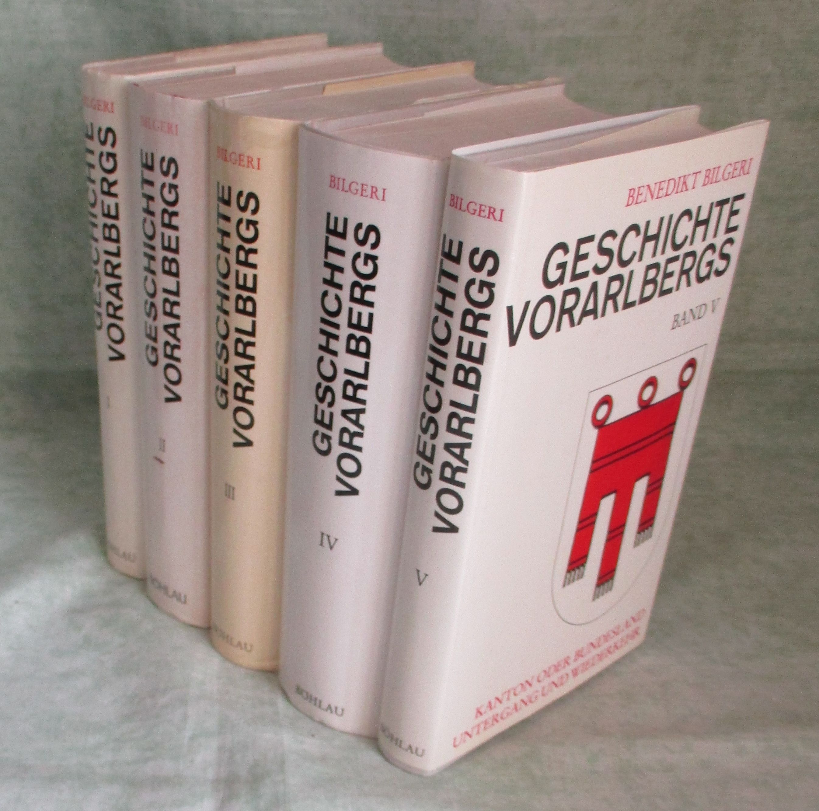 Vorarlberg – Orts- und Landeskunde Bilgeri, Benedikt: Geschichte Vorarlbergs. Bd. 1: Vom freien Rätien zum Staat der Montforter. Bd. 2: Bayern, Habsburg, Schweiz – Selbstbehauptung. Bd. 3: Ständemacht, Gemeiner Mann – Emser und Habsburger – Band 4: Zwischen Absolutismus und halber Autonomie. Bd. 5: Kanton odedr Bundesland. Untergang und Wiederkehr. 2., durchges. Aufl. Wien. Böhlau. 1976 -1987. ca. 2700 Seiten, zahlr. z.Tl. farbige Tafeln Originalleinen. Schutzumschläge zu Teil leicht nachgedunkelt, ansonsten in gutem Zustand.