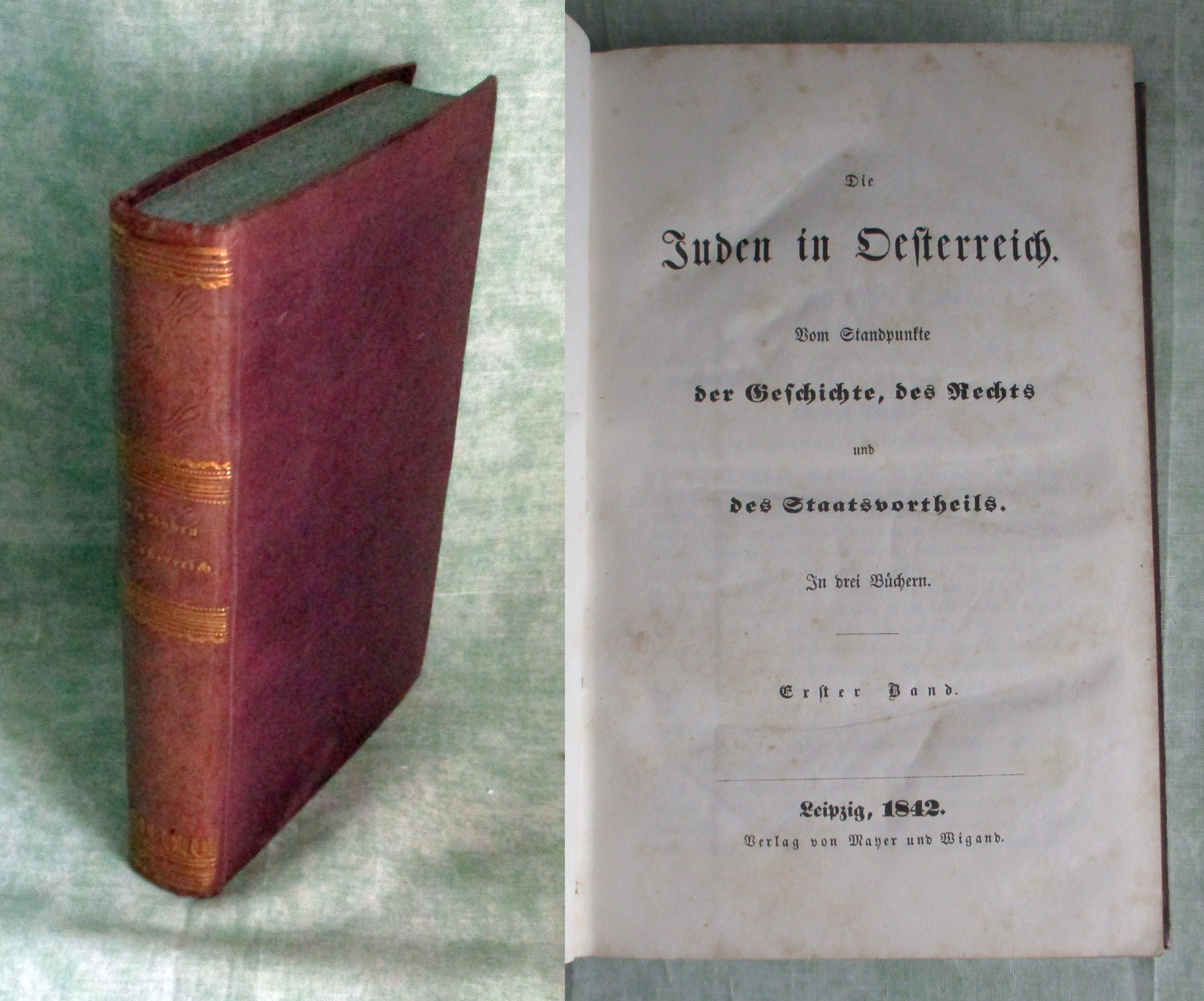 Österreich – Geschichte – Zeitgeschichte (Wertheimer, Joseph Ritter von ) Die Juden in Österreich. Vom Standpunkte der Geschichte des Rechts und des Staatsvortheils. In drei Büchern. 3 Bücher in zwei Bänden. Leipzig. Mayer und Wigand. 1842. XVI, 408, VIII, 253, [1] Seiten. Blindgeprägter Kunstleinenband mit goldgepr. Rücken in sehr gutem Zustand. Die letzten Seiten mit Durchstechung – ohne Textverlust. Inhalt – Erstes Buch: Die Juden in Oesterreich vom Standpunkt der Geschichte. Zweites Buch: Die Juden Oesterreich vom Standpunkte des Rechts. Drittes Buch: Die Juden in Oesterreich vom Standpunkte des Staatsvortheils.