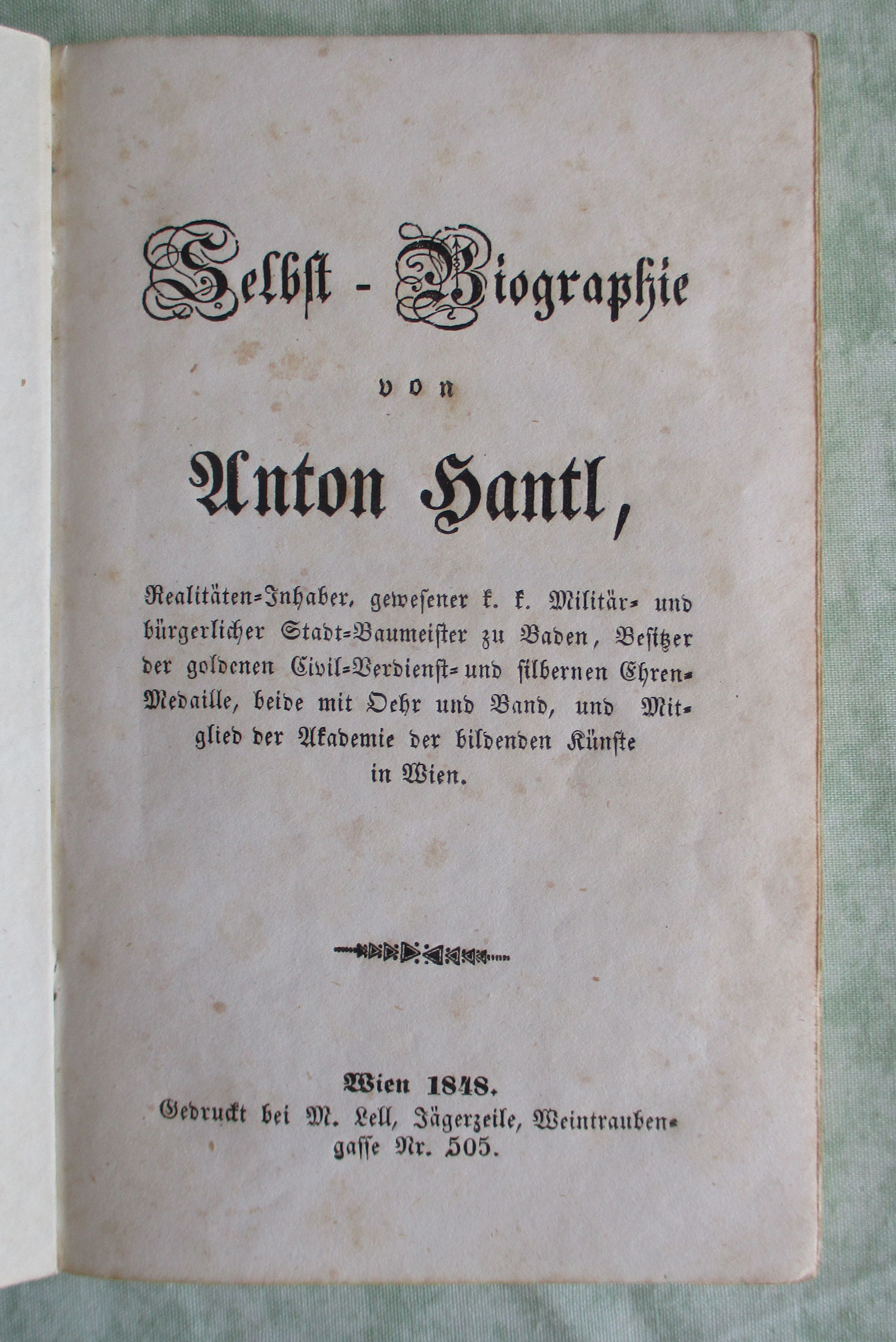 Niederösterreich – Orts- und Landeskunde Selbst-Biographie von Anton Hantl. Realitäten-Inhaber, gewesener k.k. Militär- unnd bürgerlicher Stadt-Baumeister zu Baden, Besitzer der goldenen Civil-Verdienst- und silbernen Ehren-Medaille, beide mit Oehr und Band, und Mitglied der Akademie der bildenden Künste in Wien. Wien. 1848. 38 Seiten. Schöner goldbedruckter grüner Einband der Zeit. In sehr gutem Zustand! Selbstbiographie des Badner Stadtbaumeisters Anton Hantl. Hantl war der Baumeister aller wichtigen Gebäude in Baden in der ersten Hälfte des 19. Jahrhunderts.