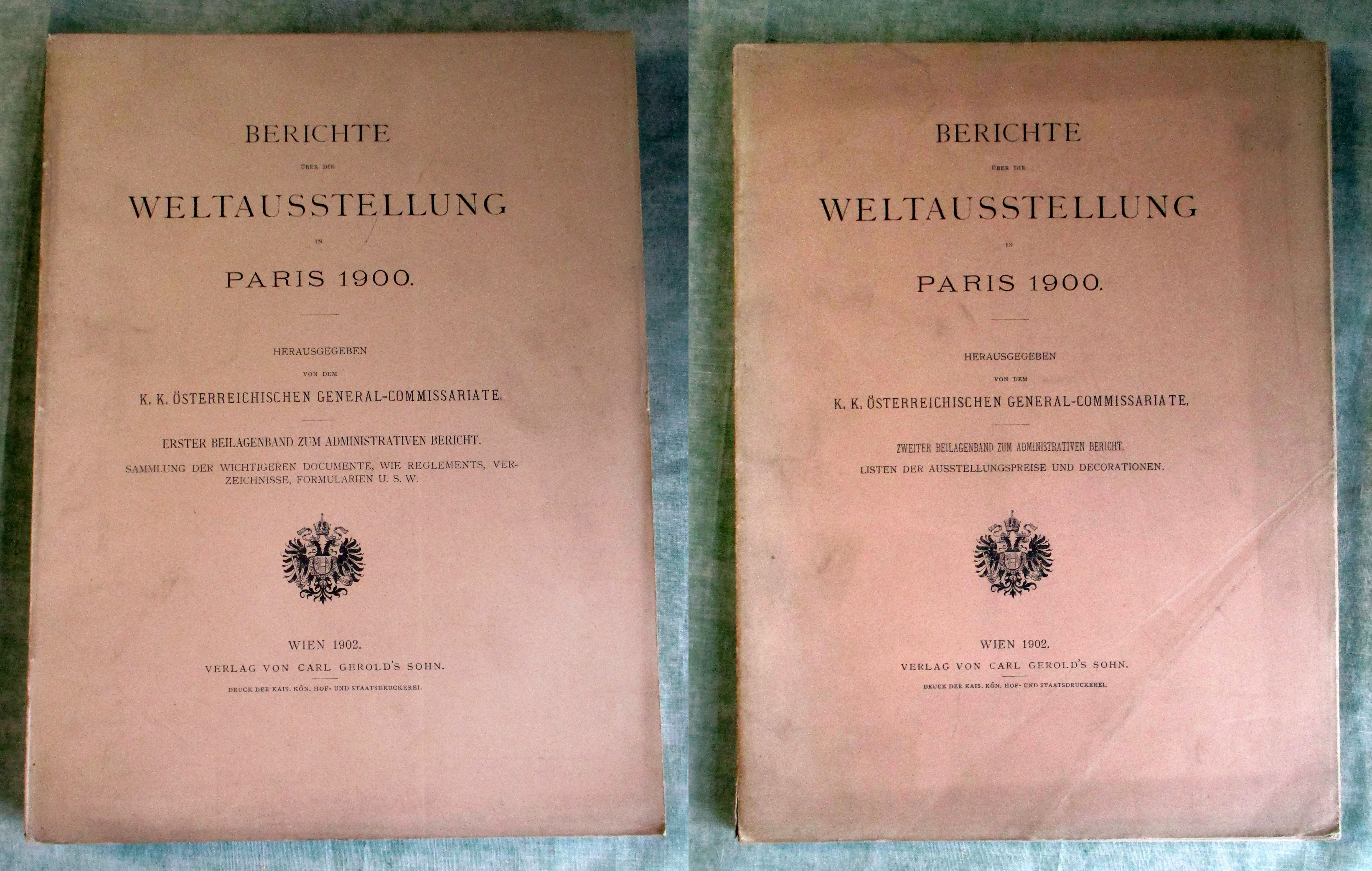 Technik + Technikgeschichte Berichte über die Weltausstellung in Paris 1900. Hrsg. von dem Österr. General-Commissariate. Erster und zweiter Beilagenband. Wien. Gerold’s Sohn. 1902. 437. 204 Seiten, zahlr. Abb. kart. Erster Beilagenband: Sammlung der wichtigeren Documente, wie Reglements, Verzeichnisse, Formularien u.s.w. Zweiter Beilagenband: Liste der Ausstellungspreise und Decorationen.