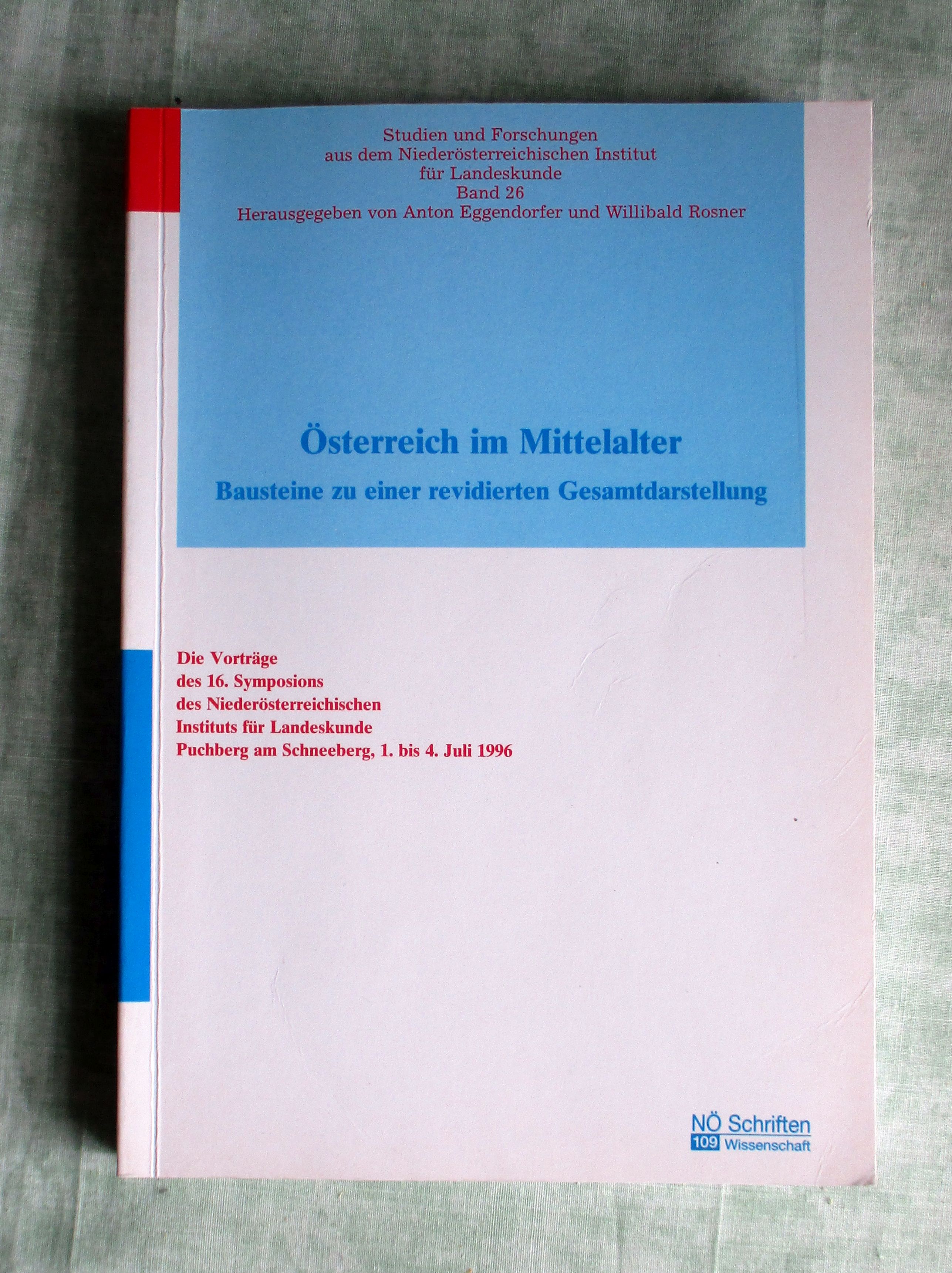 Niederösterreich – Orts- und Landeskunde Rosner, Willibald (Hrsg.): Österreich im Mittelalter. Bausteine zu einer revidierten Gesamtdarstellung ; Puchberg am Schneeberg, 1. bis 4. Juli 1996. St. Pölten, NÖ Inst. für Landeskunde, 1999. 23 cm. 378 Seitzen, zahlr. Abb. kart. Die Vorträge des … Symposions des Niederösterreichischen Instituts für Landeskunde, 16.