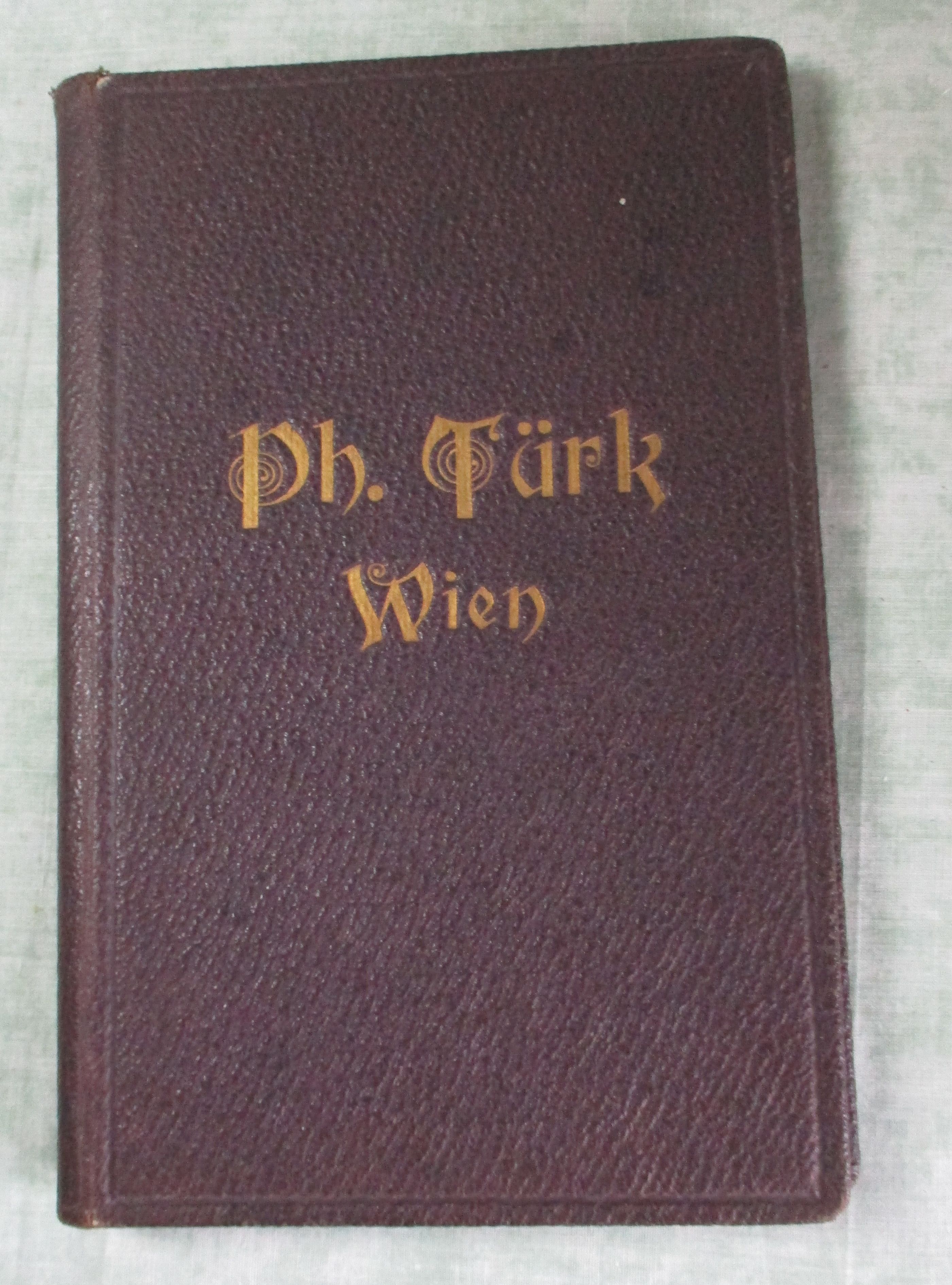 Firmengeschichte + Firmenkataloge Philipp Türk, Wien VI, Mariahilferstrasse 51. Gravier- u. Präge-Anstalt. Erzeugung von Pressungen, Eckenverzierungen etc. in Gold, Silber und Bronze, sowie von Galerien-, Perl-, Dessi- und Facon-Stäben. ca. 75 Seiten, zahlr. Abb. Goldgepr. Kunstleder. In gutem Zustand!