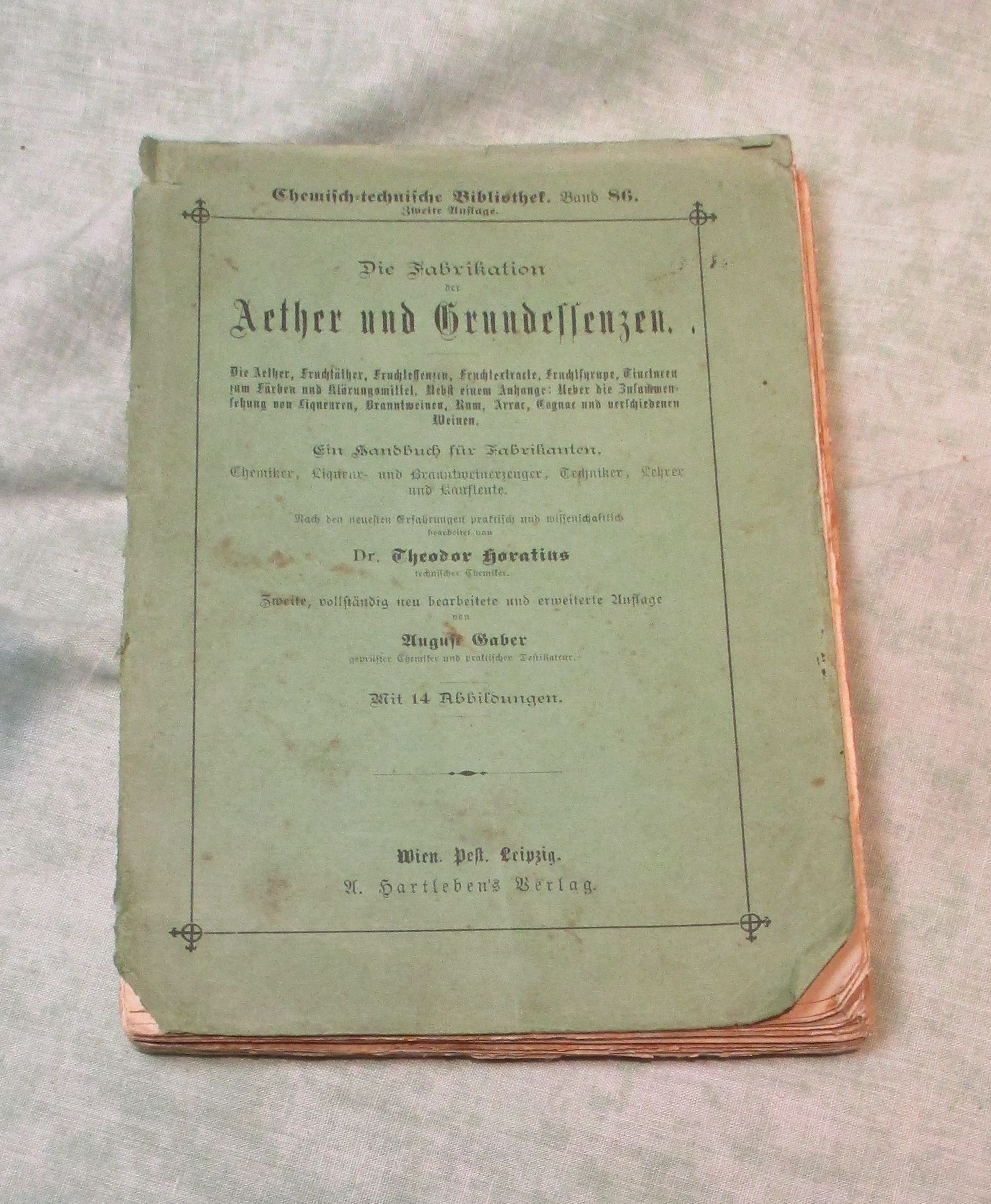 Chemische Technologie Gaber, August: Die Fabrikation der Aether und Grundessenzen. ein Handbuch für Fabrikanten, Chemiker, Liqueur- und Bra nntweinerzeuger, Techniker, Lehrer und Kaufleute. 2. Aufl. Wien. Hartlebens, 1895. XIV, 248 S. Abb. Originalbrosch. Einband mit starken Gebrauchsspuren, Rücken nur mehr rudimentär vorhanden, innen leicht fleckig. A. Hartleben’s Chemisch-technische Bibliothek, 86.