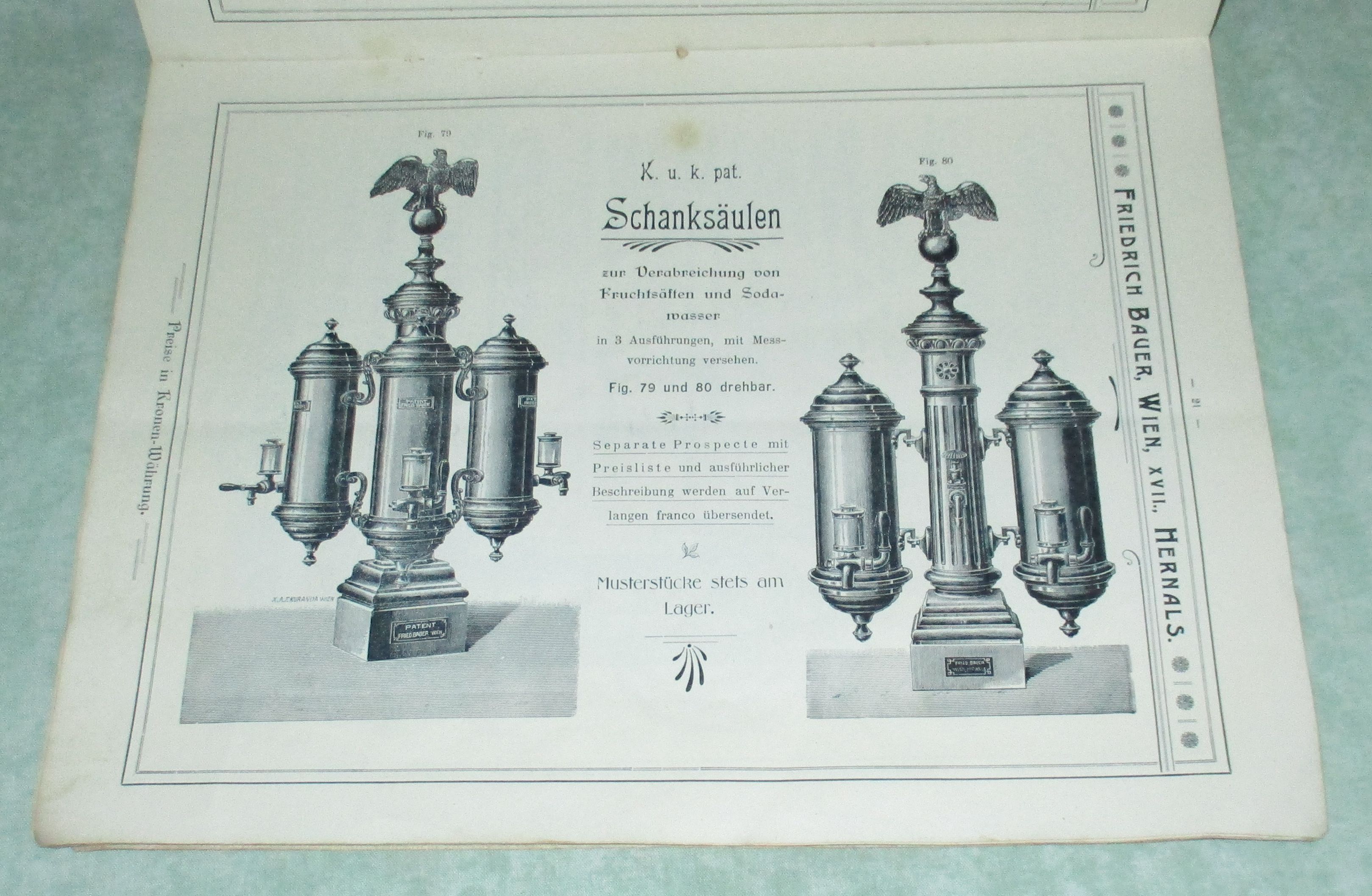 Firmengeschichte + Firmenkataloge Friedrich Bauer – Kupfer- und Metallwaren. Wien XVII/3 Haslingergasse Nr. 24. I. Abtheilung: Küchengeschirre etc. II. Abtheilung: Technische und Special-Artikel. Wien. Um 1890. 30 x 23 cm. 32 Seiten. Frontispiz: Bildnis vom Stand der Fa. Bauer in der Rotunde bei der Jubiläums-Gewerbeausstellung 1888. Äußerlich stark staubfleckig.Innen sauber. Inhalt u.a.: Kochgeschirre, Backformen, Kaffeehauskücheneinrichtungen, Waschkessel, Theekessel, Samovare, Schanksäulen, Badeöfen, Dampfkochkessel, Dampf-Kaffee-Kochmaschine. Destillir-Apparate