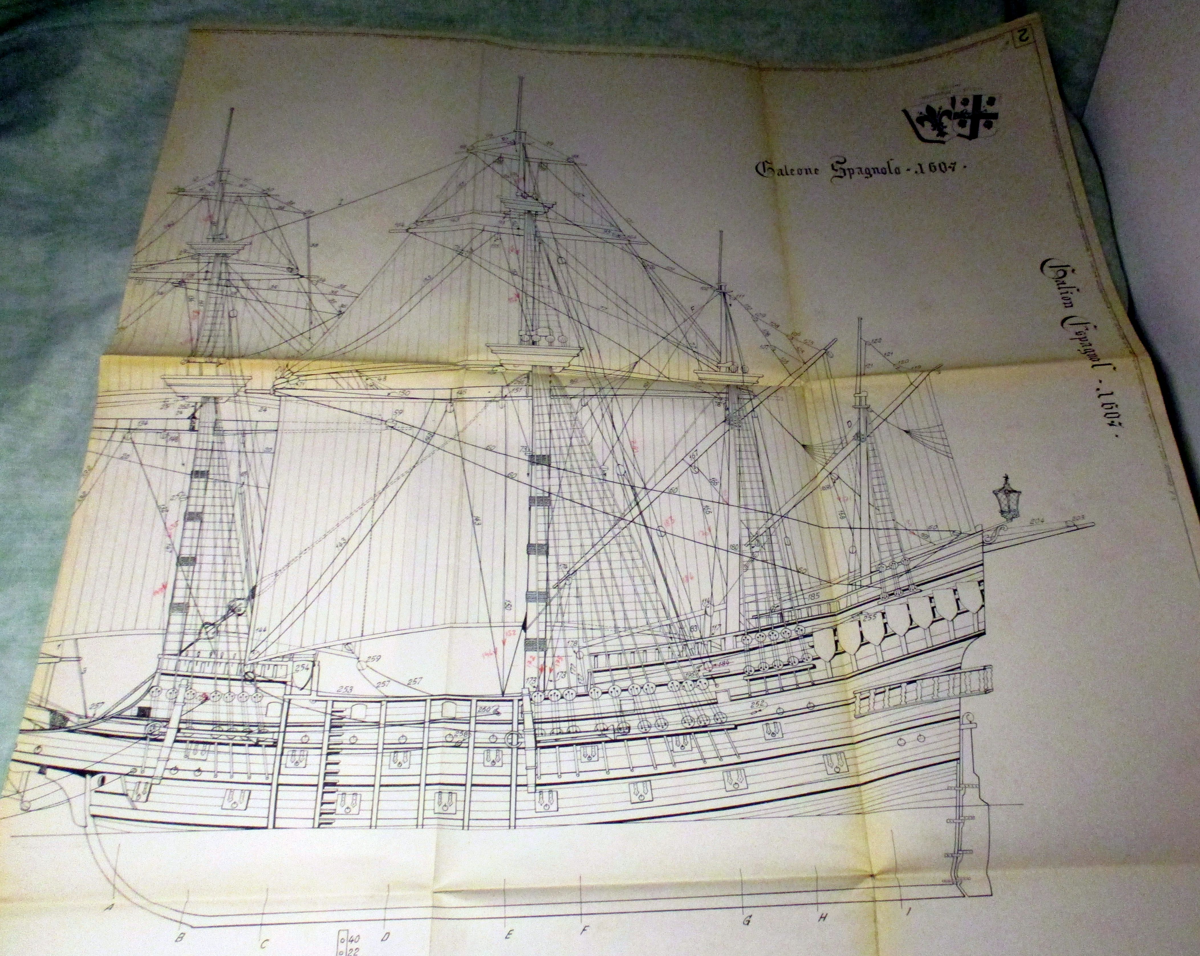 Marinegeschichte – Schiffe + Schifffahrt Vincenzo Lusci – Modelli di Navi – Florence – Italy. Galeone Spagnolo 1607. 1962. 4 großformatige, gefaltete Modellbaupläne in Mappe. In gutem Zustand!