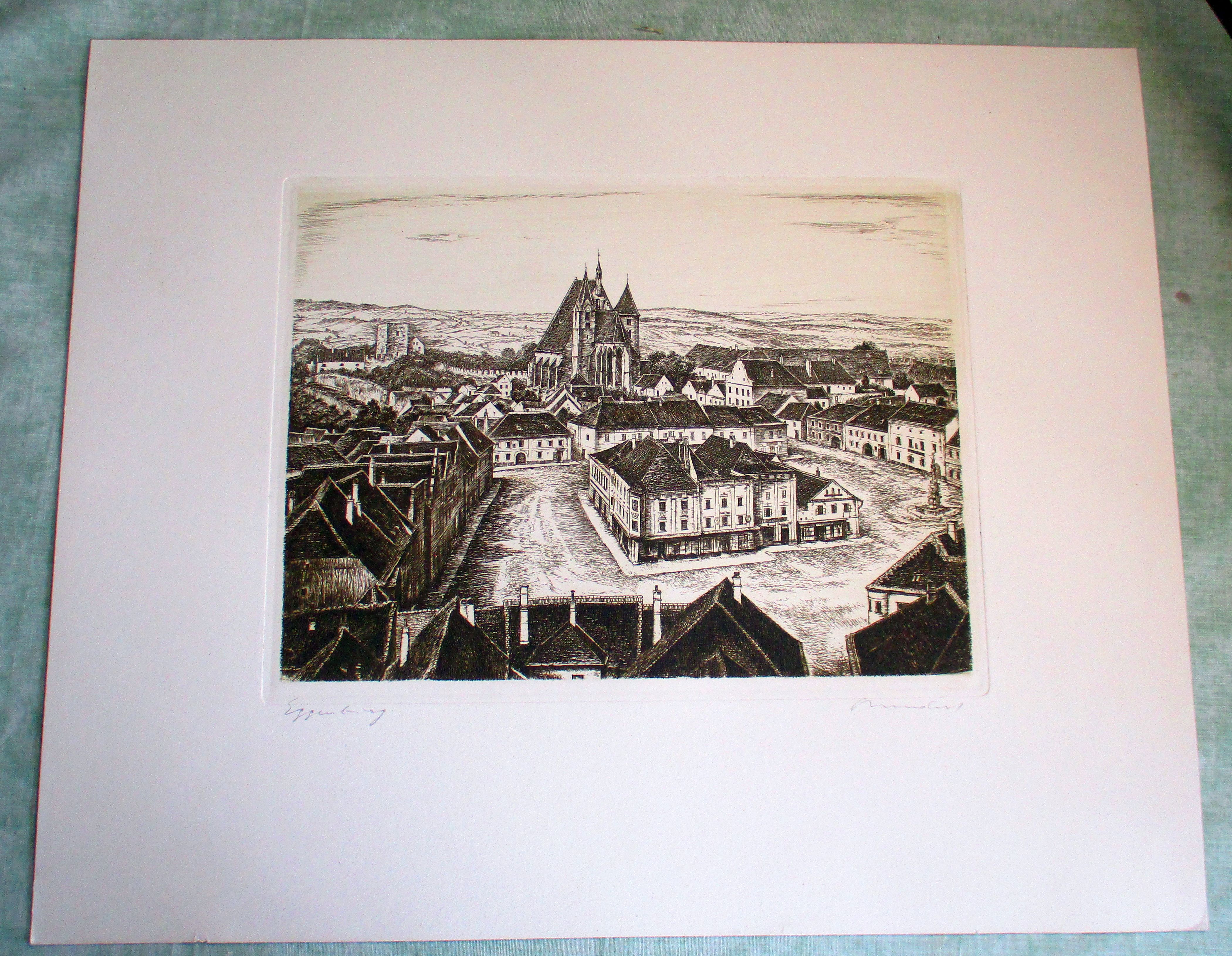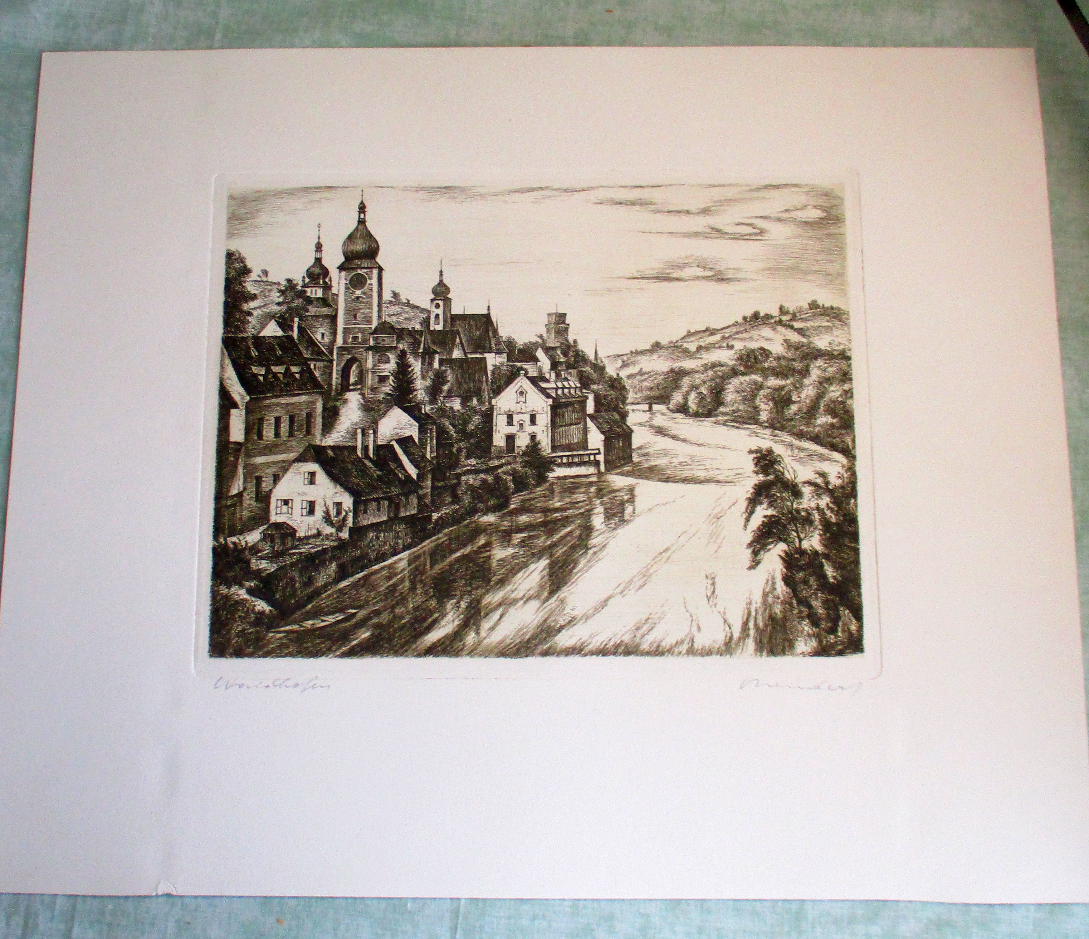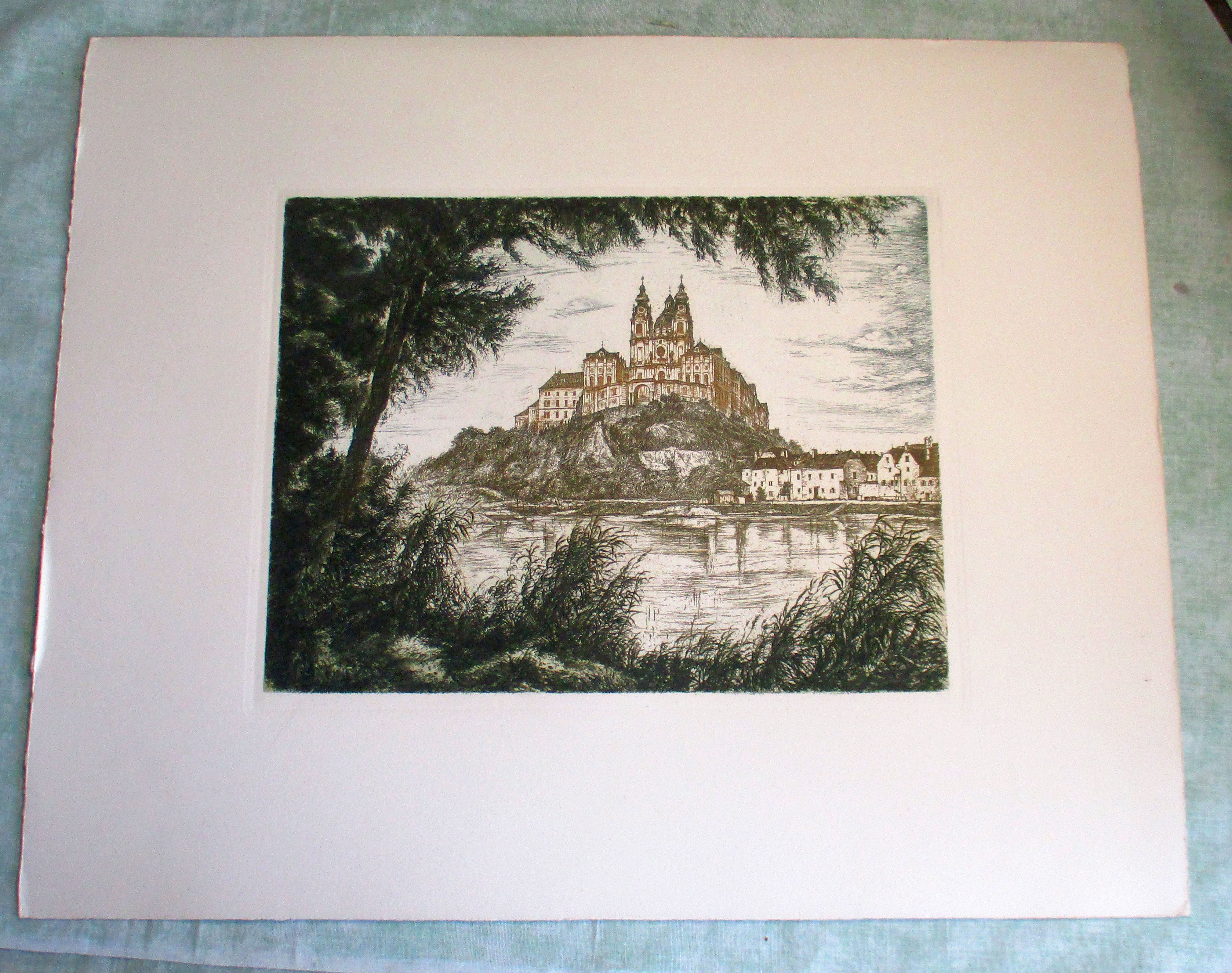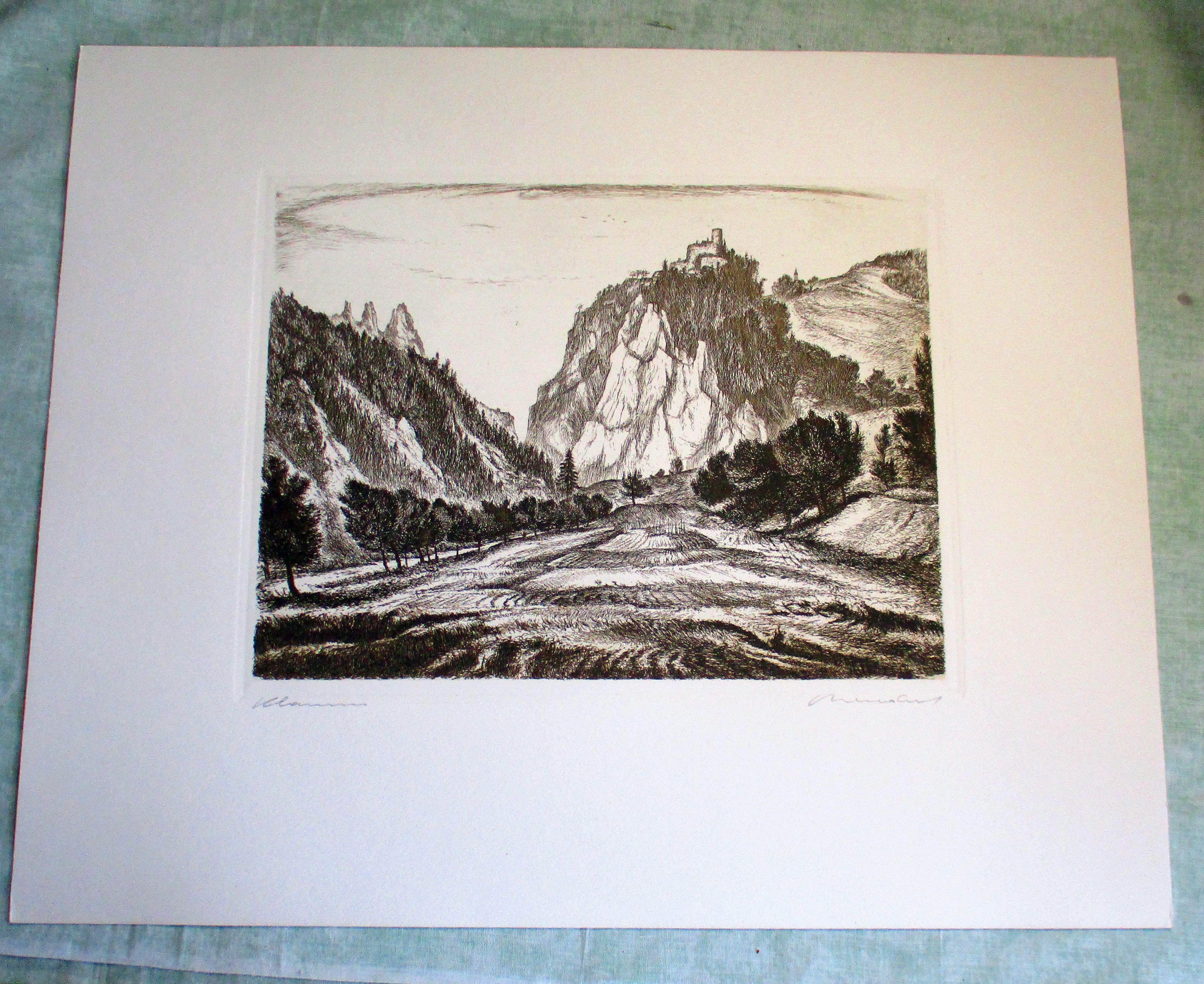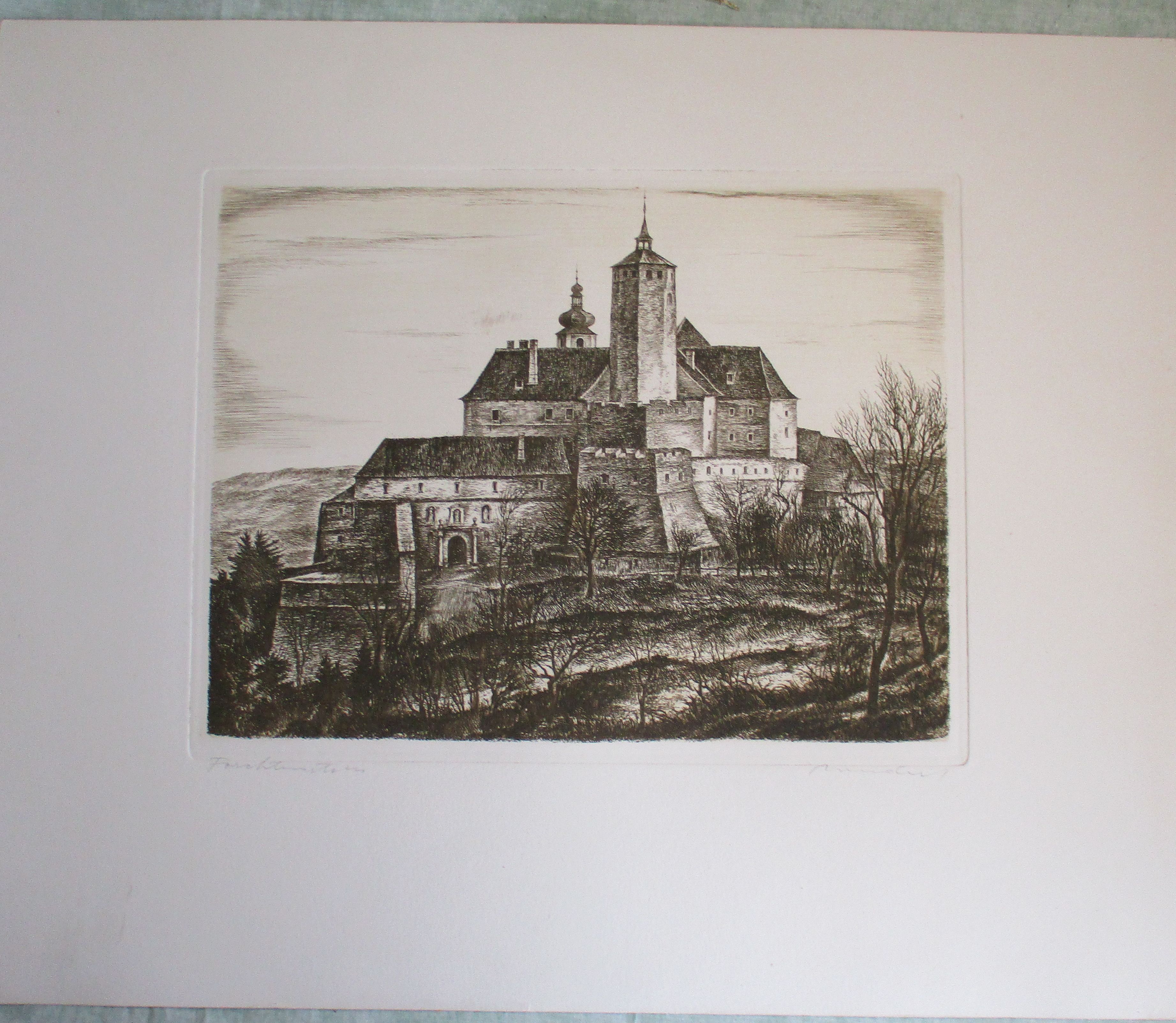 Niederösterreich – Orts- und Landeskunde Neudert, Otto. Burgen und Städte in Niederdonau. 12 Originalradierungen mit 4 Seiten einleitendem Text von Dr. Heinrich Neumayer. 1944. Quer-Folio (35 x 42 cm), Flügelmappe m. aufkaschiertem Deckelschild. Mappe staubfleckig, Ecken bestossen, Innenbezug des vorderen Mappendeckels fehllt. Radierungen tadellos. Radierungen zum Teil beschriftet und signiert. Original-Radierungen mit Ansichten von Dürnstein, Eggenburg, Gloggnitz, Klamm, Melk, Rosenburg, Stockzahn, Waidhofen, Forchtenstein, Brün, Iglau und Theben.