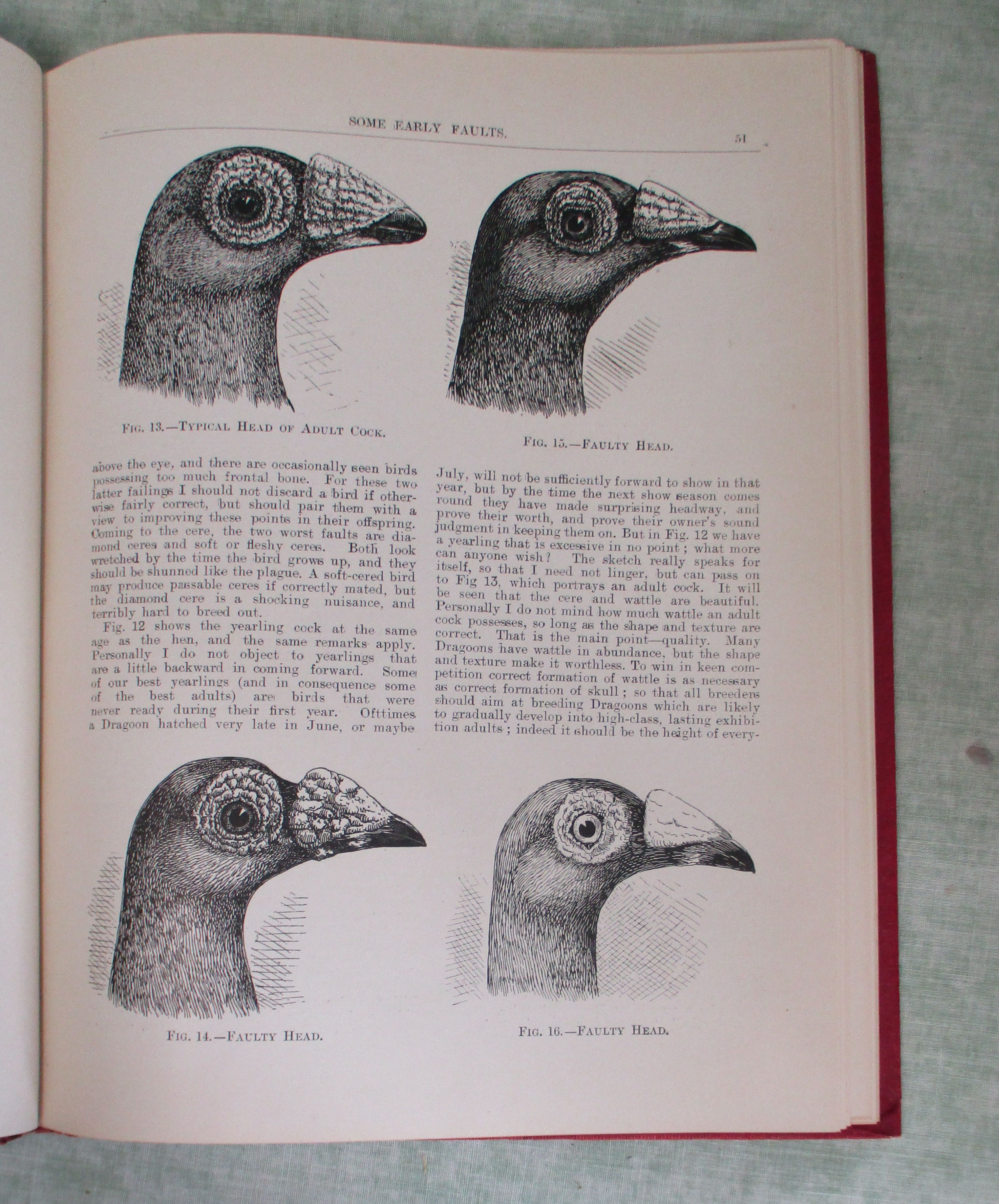 Stubenvögel-, Geflügel-, und Taubenliteratur Fletcher, W.R. Dragoons. Their Varieties and their Managment throughout the Year. Assited by leading Specialists on the Different Colors, with a chapte on Diseases …. The Feathered World – Canary and Cage Bird Life. 1908. 103 p., 30 illustr. cloth. The original edition in very good condition. The work is considered a classic among pigeon breeders and describes in detail the breed characteristics of the Dragoon pigeon, including its history and breeding standards.