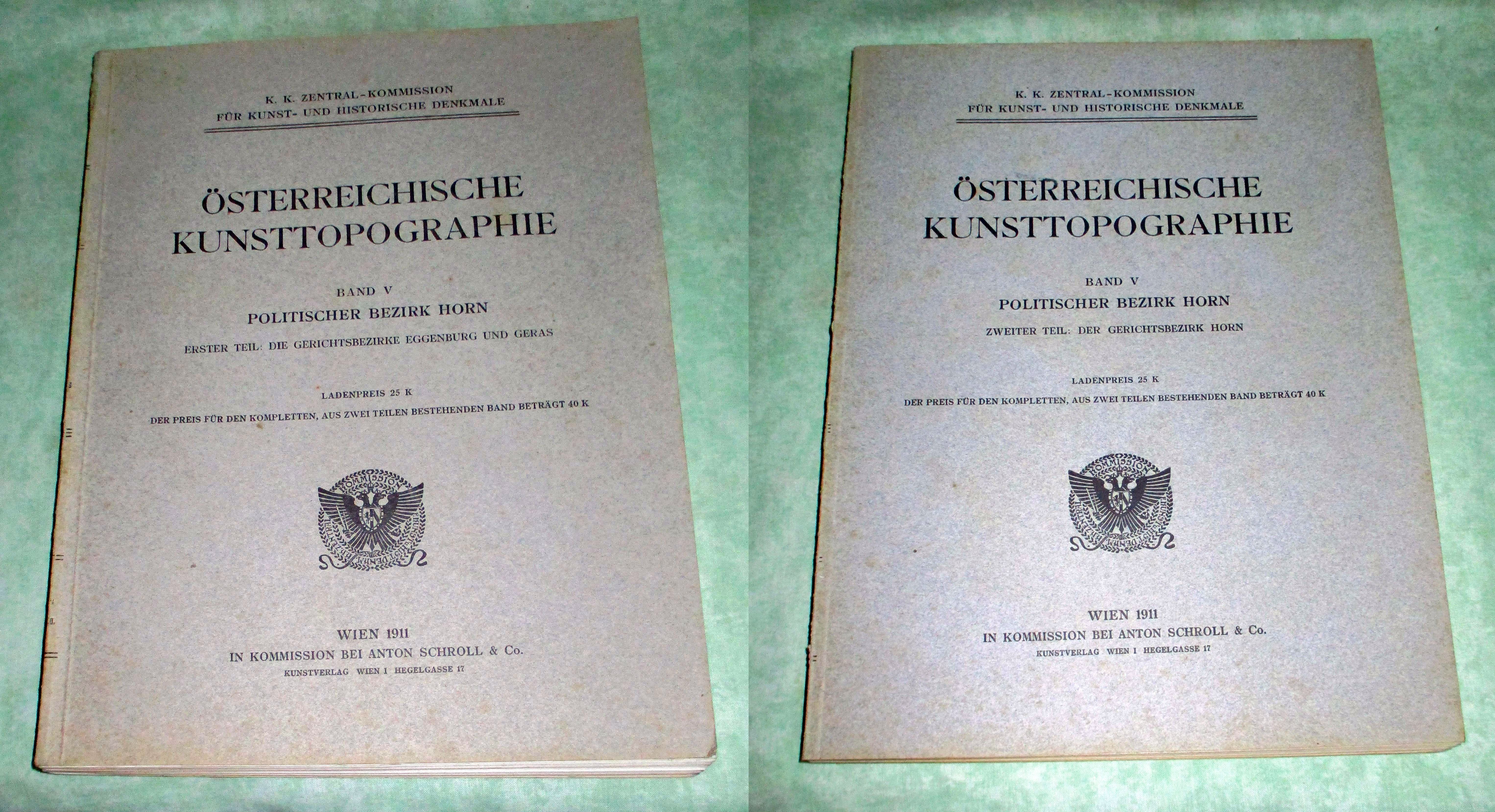 Österr. Kunst- und Architekturgeschichte Tietze, Hans / Hoernes, Moritz / Krahuletz, Johann. Österreichische Kunsttopographie. Band V: Die Denkmale des Bezirkes Horn in Niederösterreich. I. Teil: Die Denkmale der Gerichtsbezirke Eggenburg und Geras. II. Teil: Der Gerichtsbezirk Horn. 2 Bände. Wien. K.K. Zentralkommission f. Kunst und historische Denkmale. 1911. LXVII. 581 Seiten, 21 Tafeln, 391 Textabb. kart.