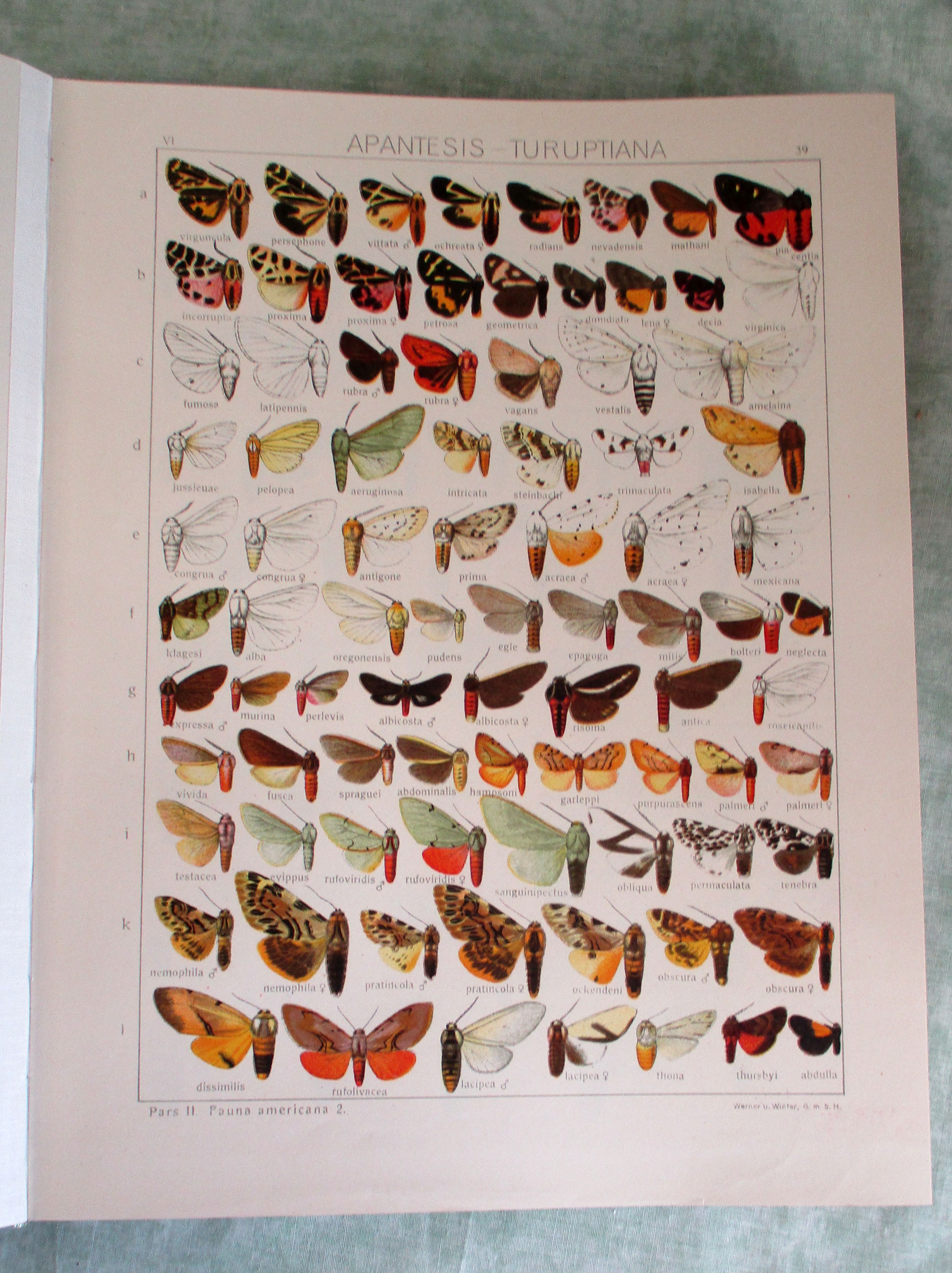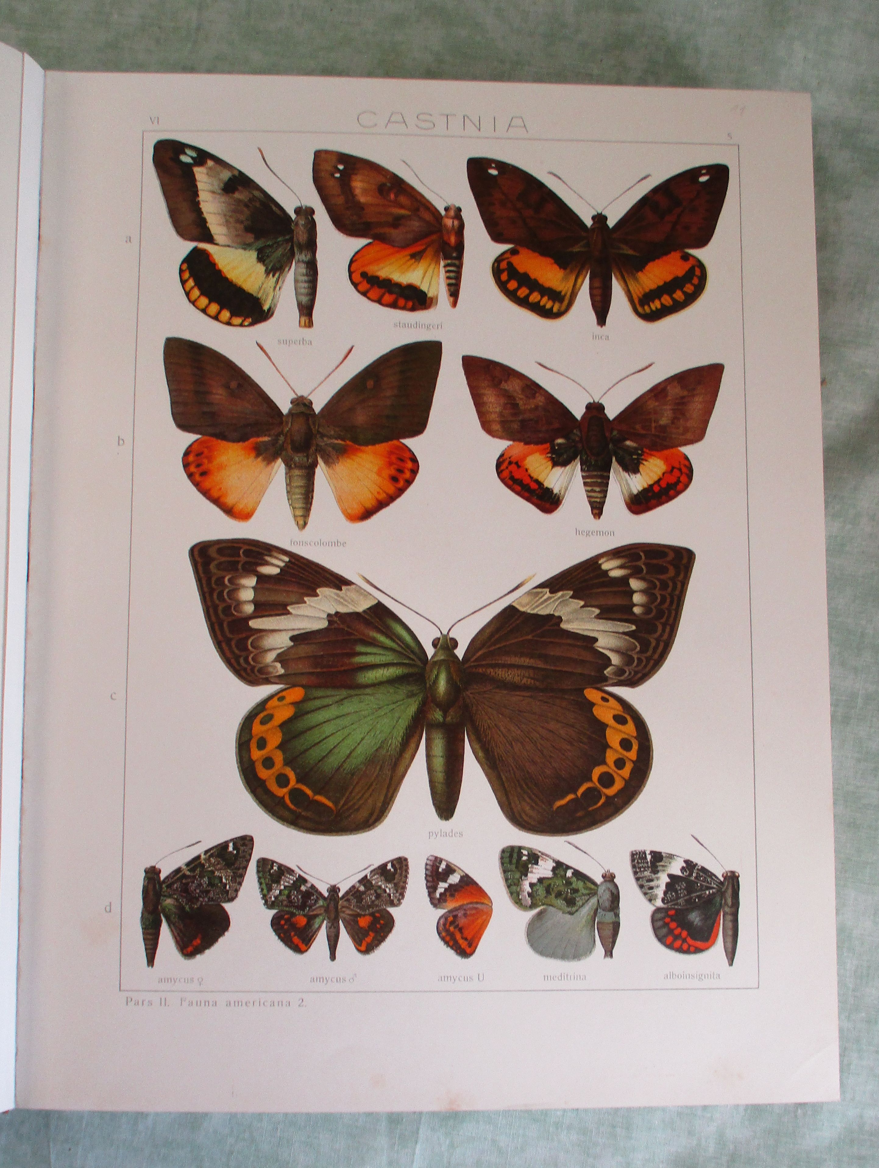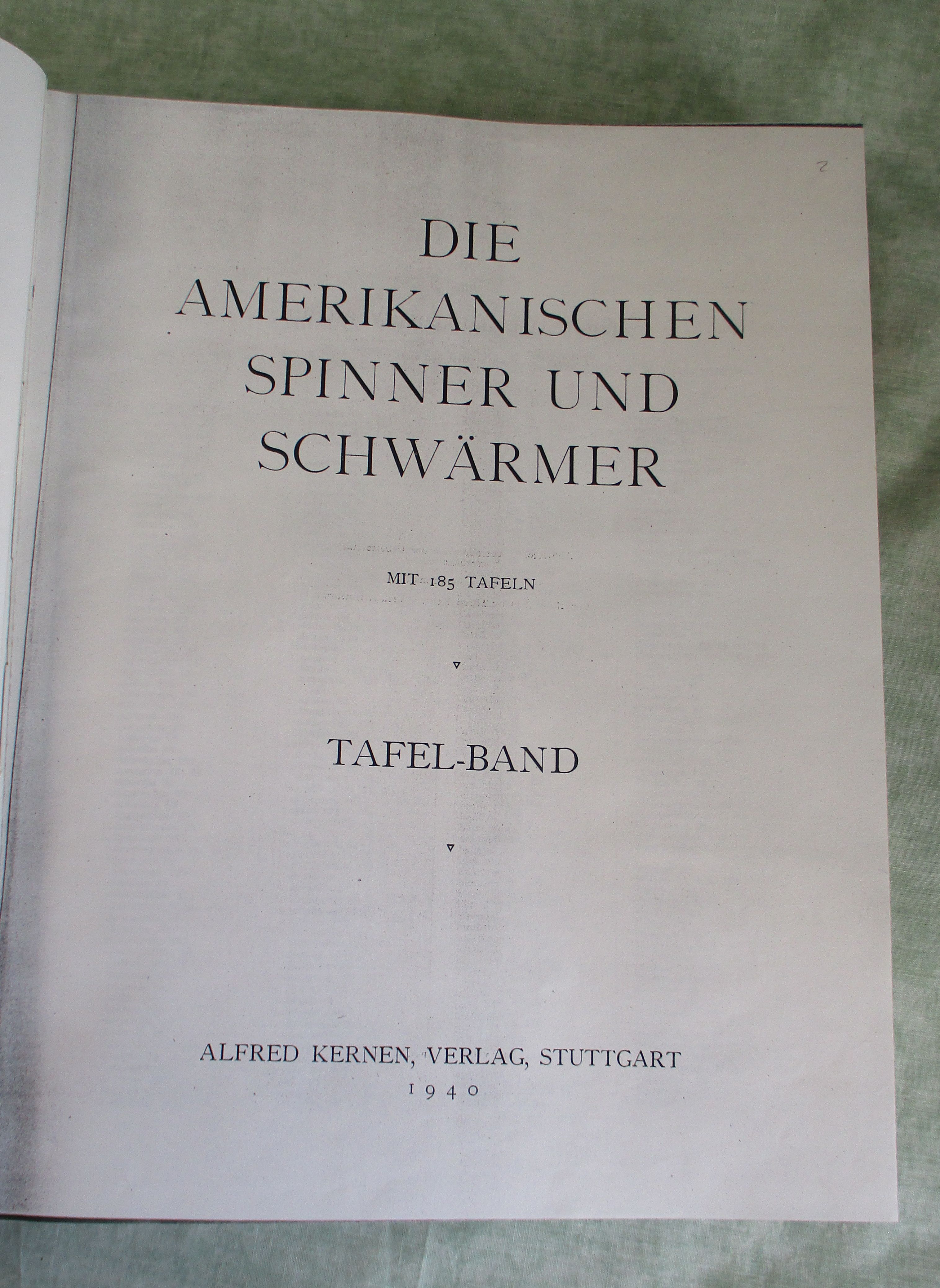 Lepidoptera – Schmetterlinge Seitz, Adalbert. Die Großschmetterlinge der Erde. 6. Band. Die amerikanischen Spinner und Schwärmer. Tafelband mit 185 Tafeln. (Insgesamt um ca. 8 Tafeln mehr, da manche Nummern mit mehreren Tafeln.) 1940. VII (Inhaltsverzeichnis der Tafeln). 185 Tafeln (insgesamt ca. 190) Titelblätter, Inhaltsverzeichnis und ca.70 (von 190) Tafeln Farbkopien. Schöner Halblederband mit goldgepr. Rückenschild. Eine systematische Bearbeitung der bisher bekannten Gross-Schmetterlinge. II. Abteilung – Exotische Fauna. 6. Band. Tafeln.
