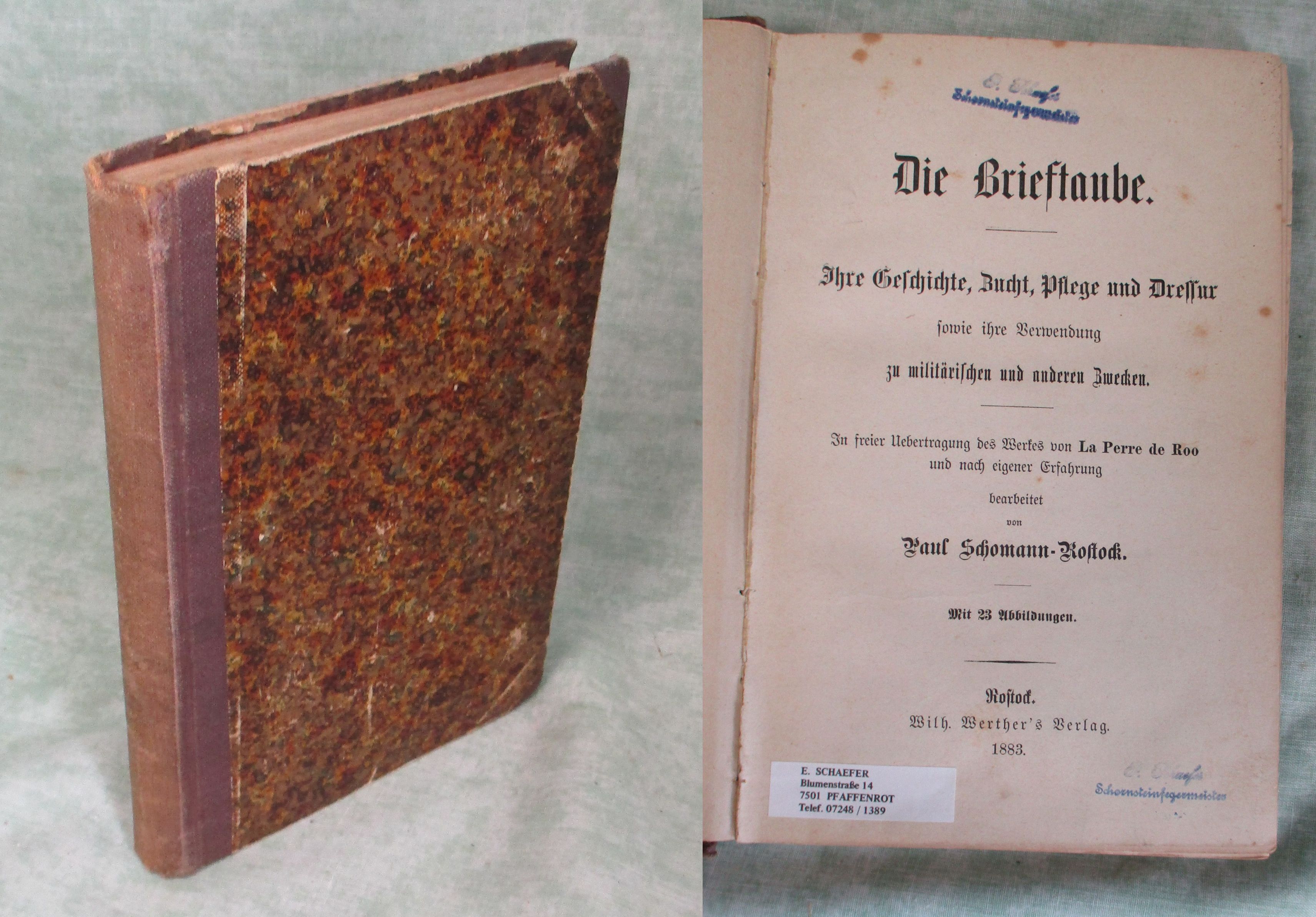 Stubenvögel-, Geflügel-, und Taubenliteratur Schomann, Paul. Die Brieftaube. Ihre Geschichte, Zucht, Pflege und Dressur sowie ihre Verwendung zu militärischen und anderen Zwecken. Rostock. Werther. 1883. 224 Seiten, 23 Abb. Halbleinen. Einband berieben und bestossen, mehrere Vorbesitzerstempel am Titel. Einige Seiten leicht fleckig. Bindung jedoch fest. Insgesamt ein sammelwürdiges Ex. des äußerst seltenen Werkes!