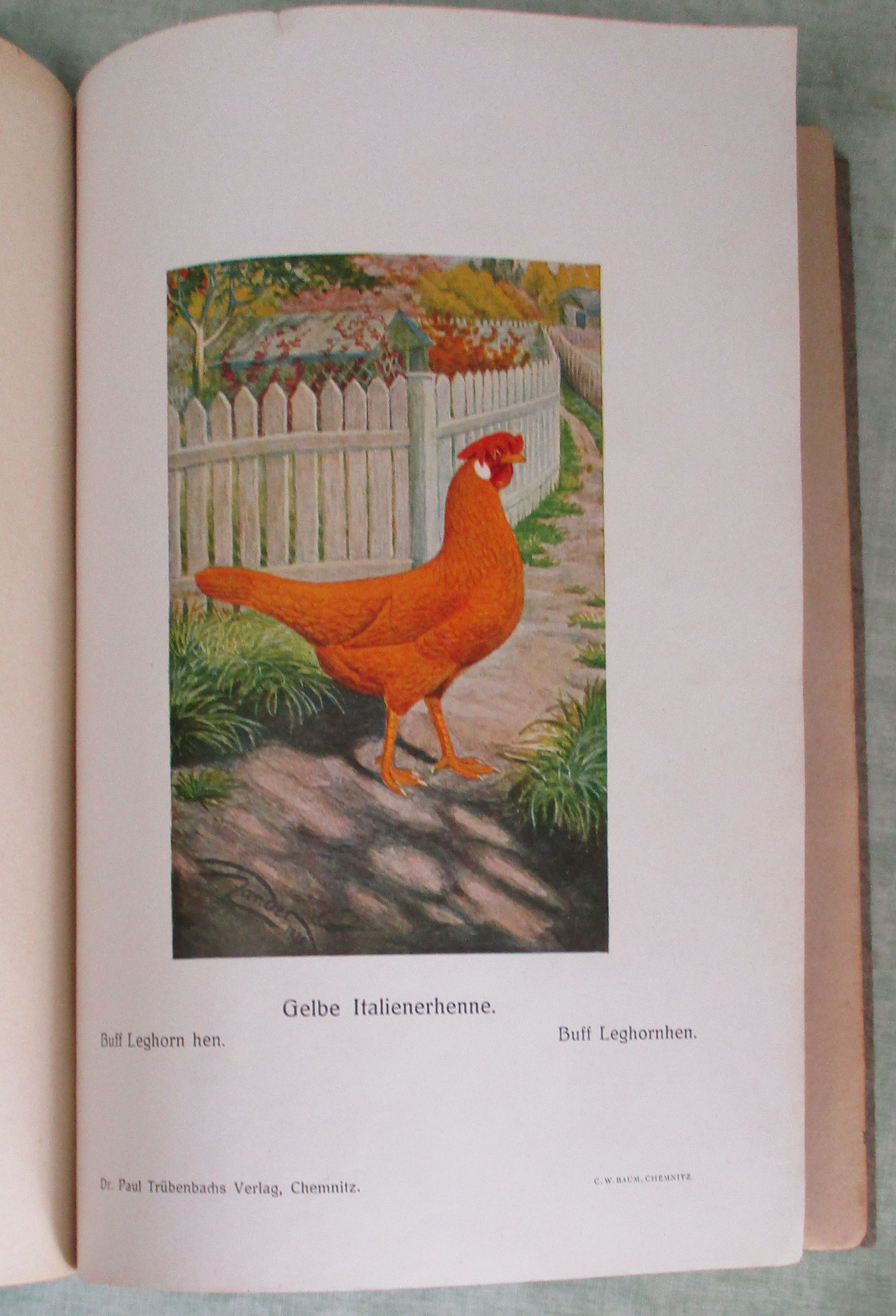 Stubenvögel-, Geflügel-, und Taubenliteratur Wulf, Arthur. Handbuch für Italienerzüchter. Eine ausführliche Anleitung zur Haltung, Zucht und Pflege des Italienerhuhns. Chemnitz. Dr. Paul Trübenbachs Verlag. 109 Seiten, 28 Textabbildungen, 23 farbige Tafeln. kart. Einband mit kleinem Eckabriss. (siehe Bilder)