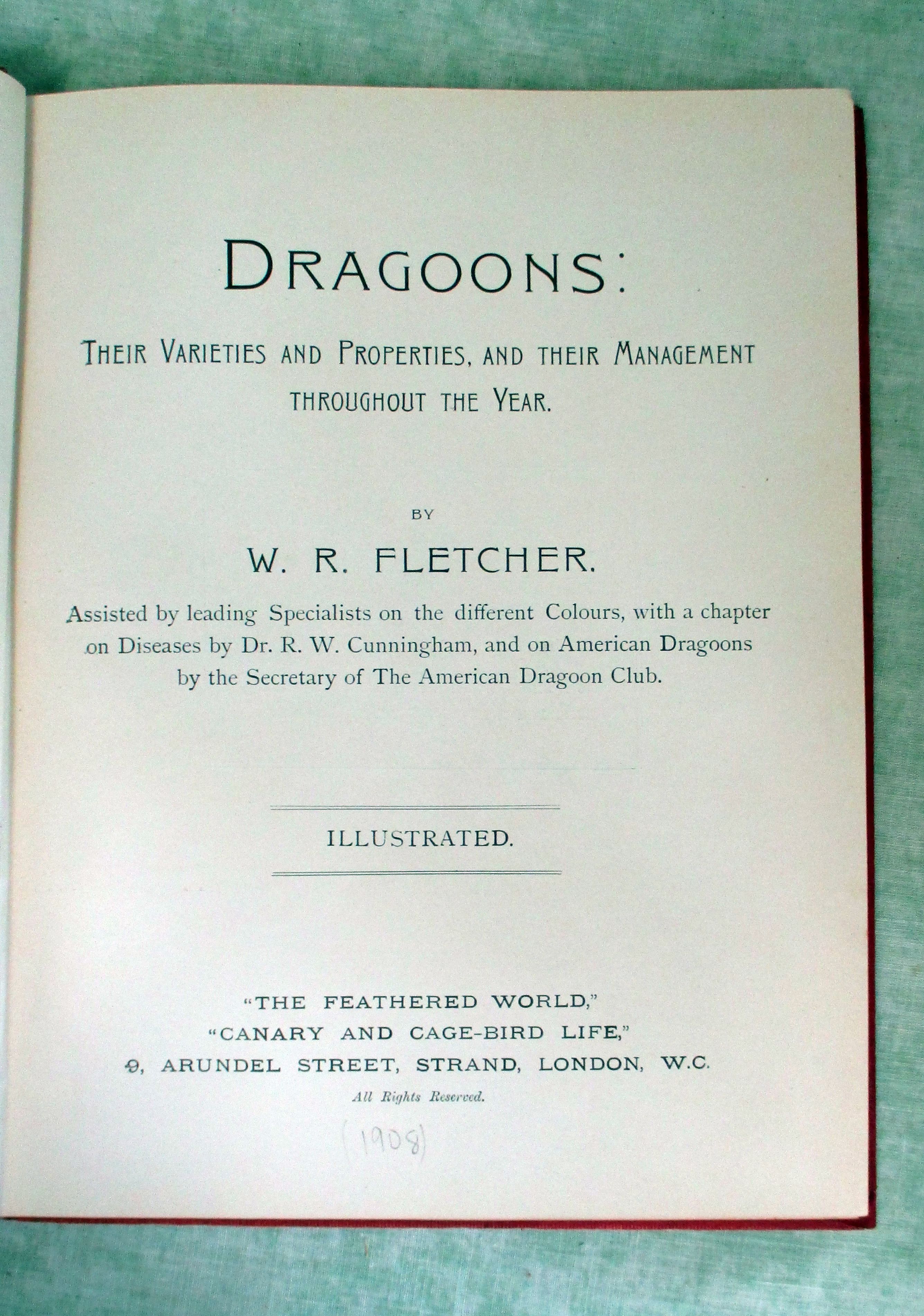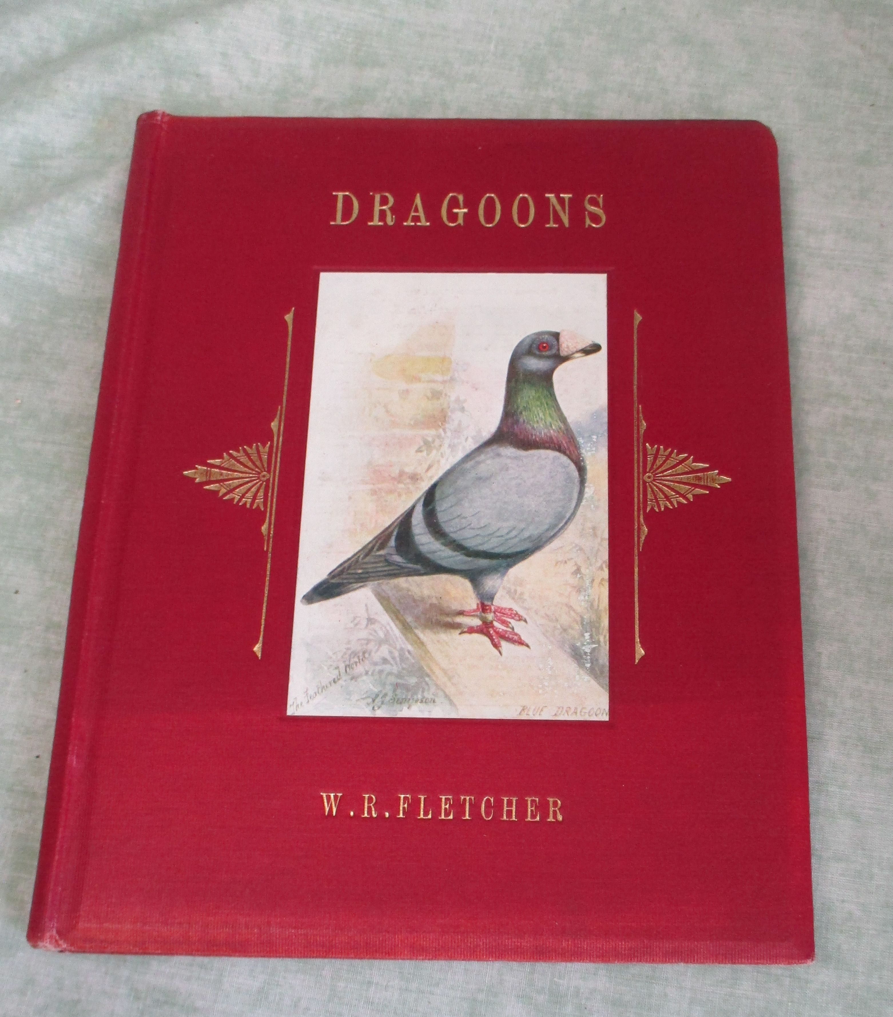 Stubenvögel-, Geflügel-, und Taubenliteratur Fletcher, W.R. Dragoons. Their Varieties and their Managment throughout the Year. Assited by leading Specialists on the Different Colors, with a chapte on Diseases …. The Feathered World – Canary and Cage Bird Life. 1908. 103 p., 30 illustr. cloth. The original edition in very good condition. The work is considered a classic among pigeon breeders and describes in detail the breed characteristics of the Dragoon pigeon, including its history and breeding standards.